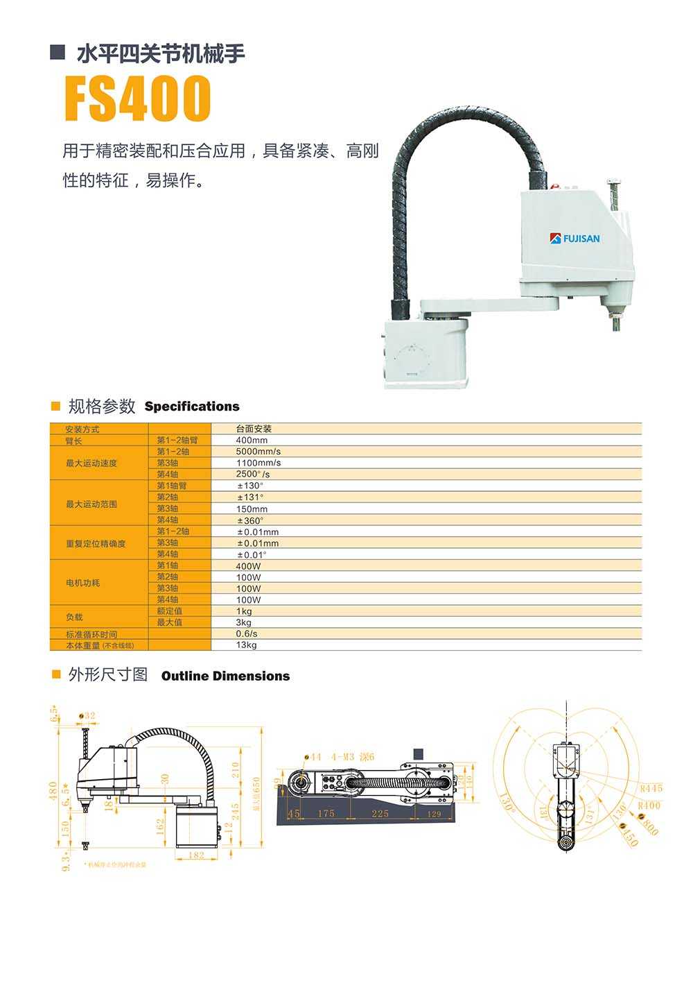 所屬型號:FS400 所屬品牌:福士工業(yè) 所屬分類:四關節(jié)機械手 應用領域:紡織行業(yè) 電梯行業(yè) 機床行業(yè)
